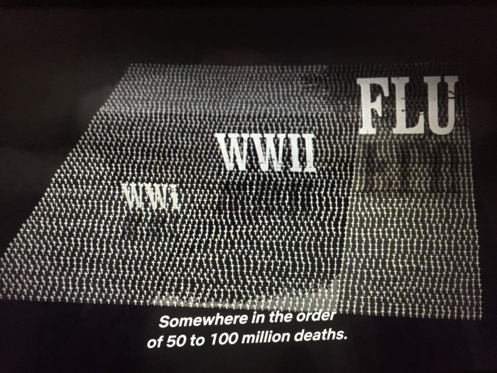 He empezado a ver esta serie documental sobre gripe, virus y el riesgo constante de pandemia en el que vivimos. Estiman que un brote incontrolado podría acabar con la mitad de la población. Aterrador el dato de que con la Gripe Española de 1918 murió más gente que en las dos guerras mundiales juntas.